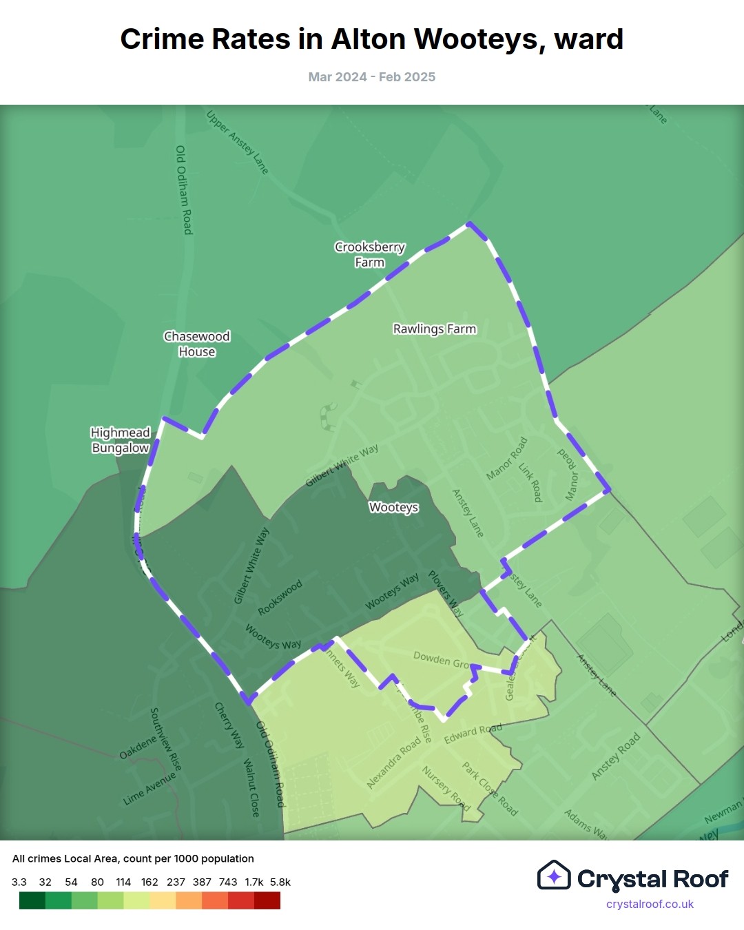 The figures in grey indicate the relative ratings of Alton Wooteys (ward) for a specific crime type compared to other wards in England and Wales.