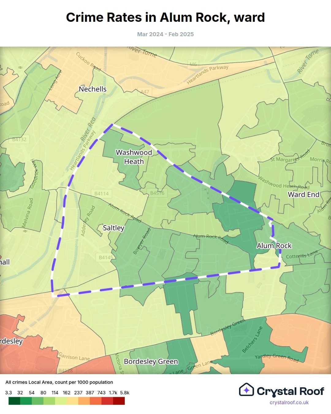 Alum Rock, (ward) includes areas with the following crime ratings (see map):