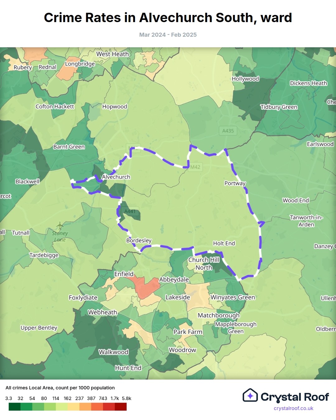 Alvechurch South, (ward) includes areas with the following crime ratings (see map):