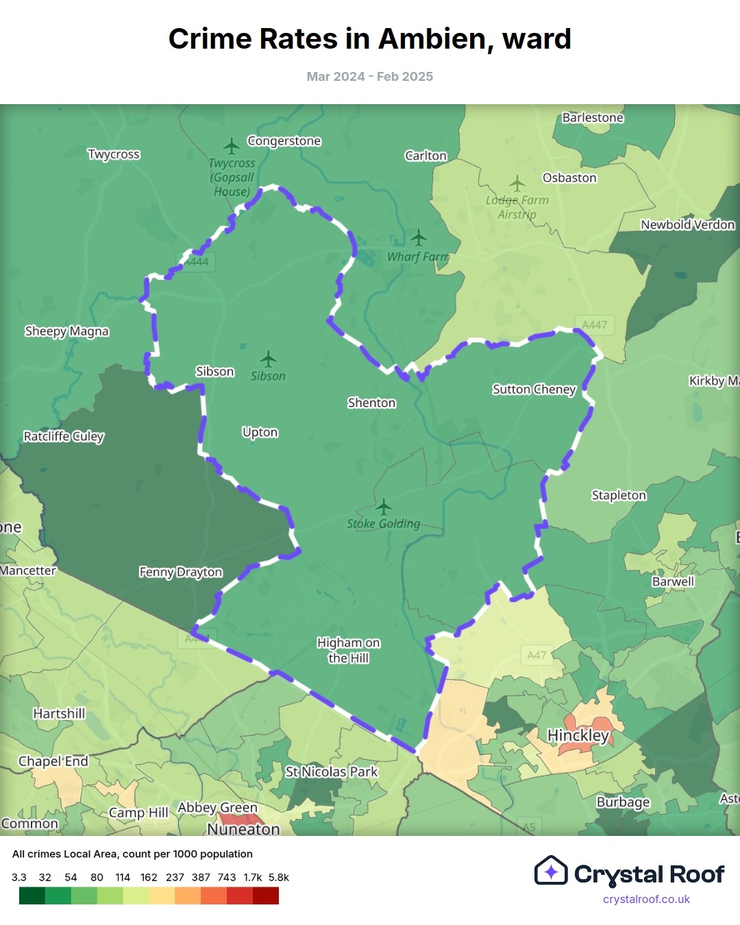 Ambien (ward) is located within Hinckley and Bosworth (borough). Annual total crime rate in Hinckley and Bosworth (borough) is 70.4 crimes per thousand resident population, which can be rated as 2 out of 10 or low crime level compared to other local authority districts in England and Wales.