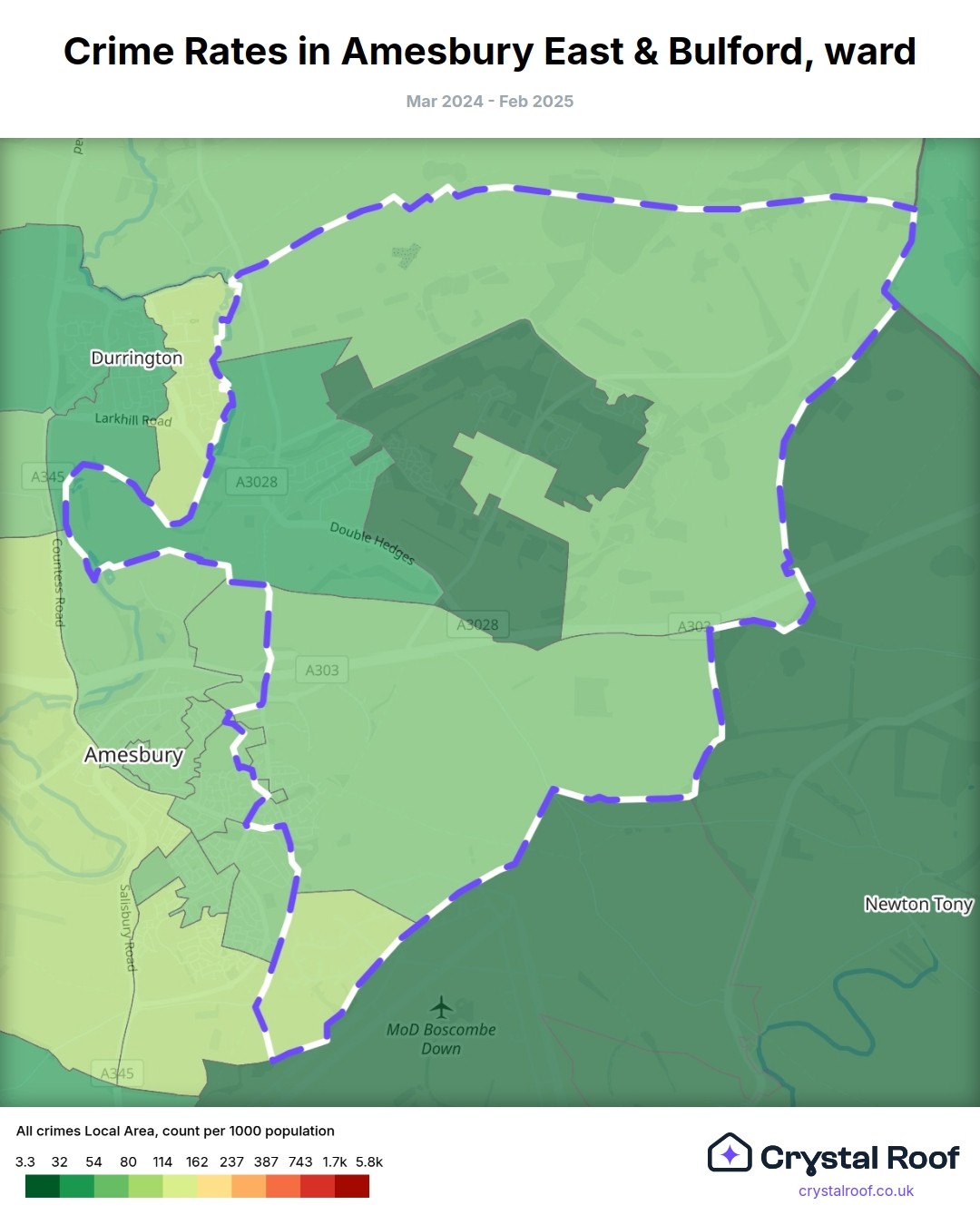 Amesbury East & Bulford, (ward) includes areas with the following crime ratings (see map):