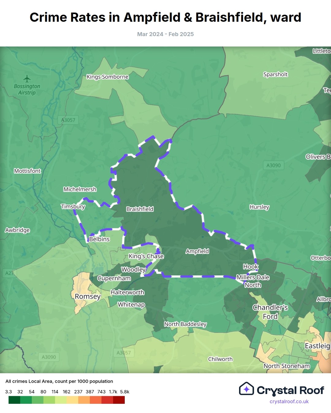 Ampfield & Braishfield, (ward) includes areas with the following crime ratings (see map):