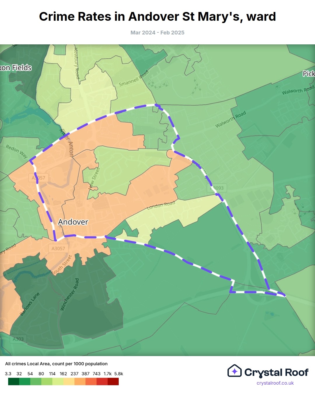Andover St Mary's, (ward) includes areas with the following crime ratings (see map):