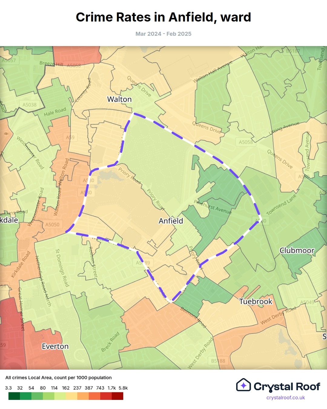 Anfield, (ward) includes areas with the following crime ratings (see map):