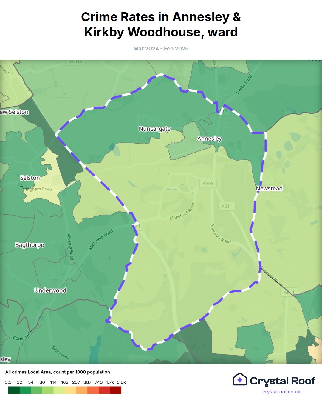 Annesley & Kirkby Woodhouse, (ward) includes areas with the following crime ratings (see map):