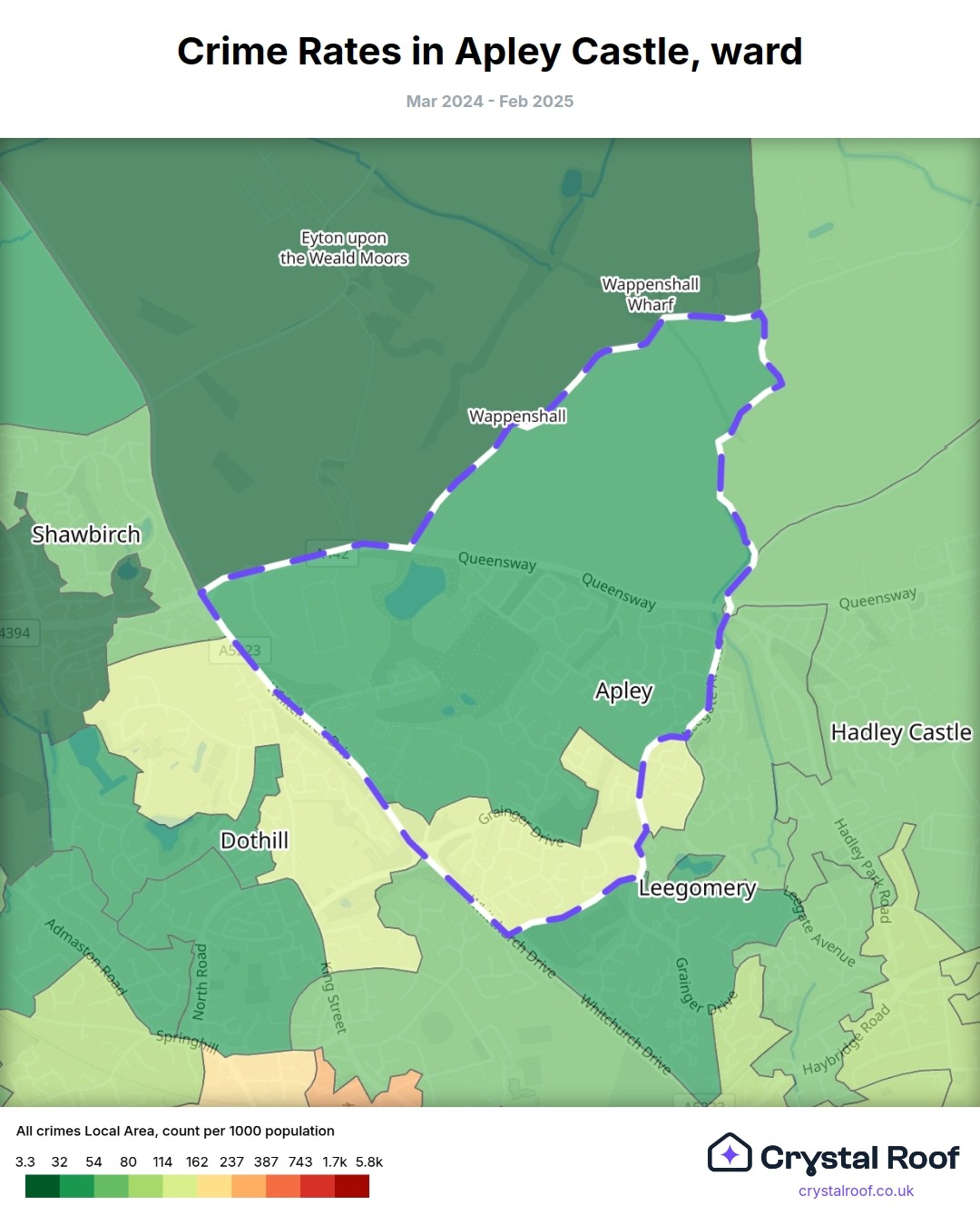 Apley Castle, (ward) includes areas with the following crime ratings (see map):