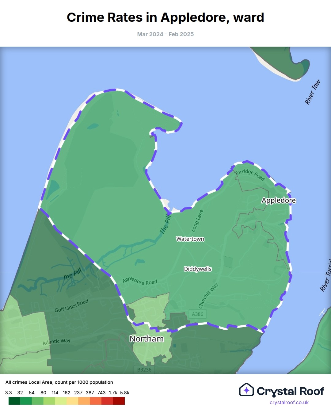 Appledore (ward) is located within Torridge (borough). Annual total crime rate in Torridge (borough) is 57.8 crimes per thousand resident population, which can be rated as 2 out of 10 or low crime level compared to other local authority districts in England and Wales.