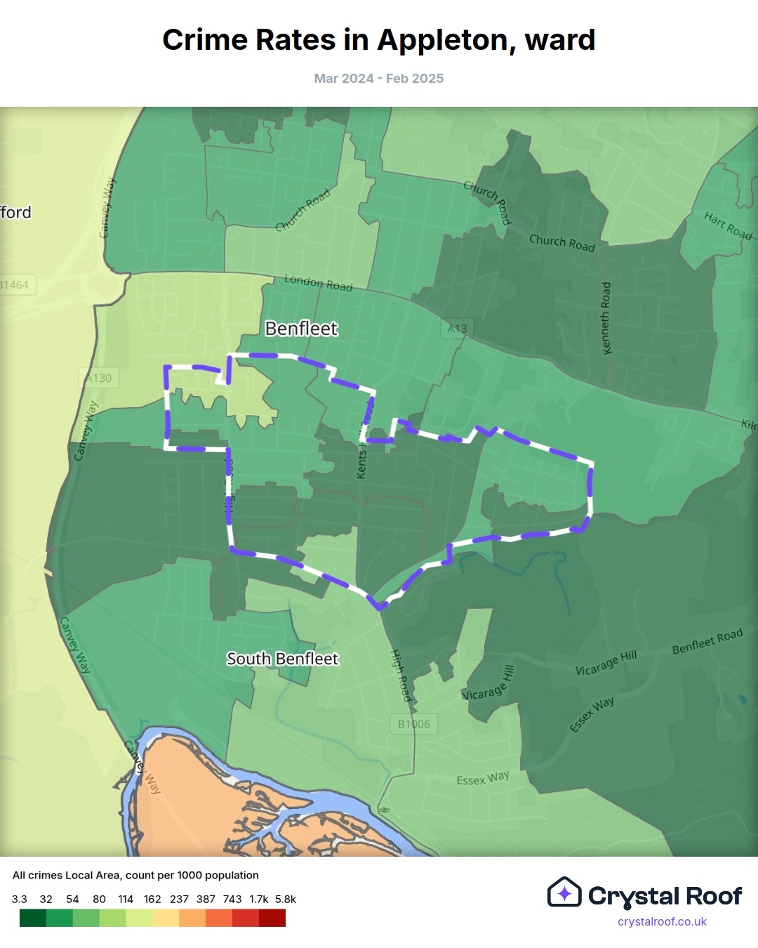 Appleton (ward) is located within Castle Point (borough). Annual total crime rate in Castle Point (borough) is 61.2 crimes per thousand resident population, which can be rated as 2 out of 10 or low crime level compared to other local authority districts in England and Wales.