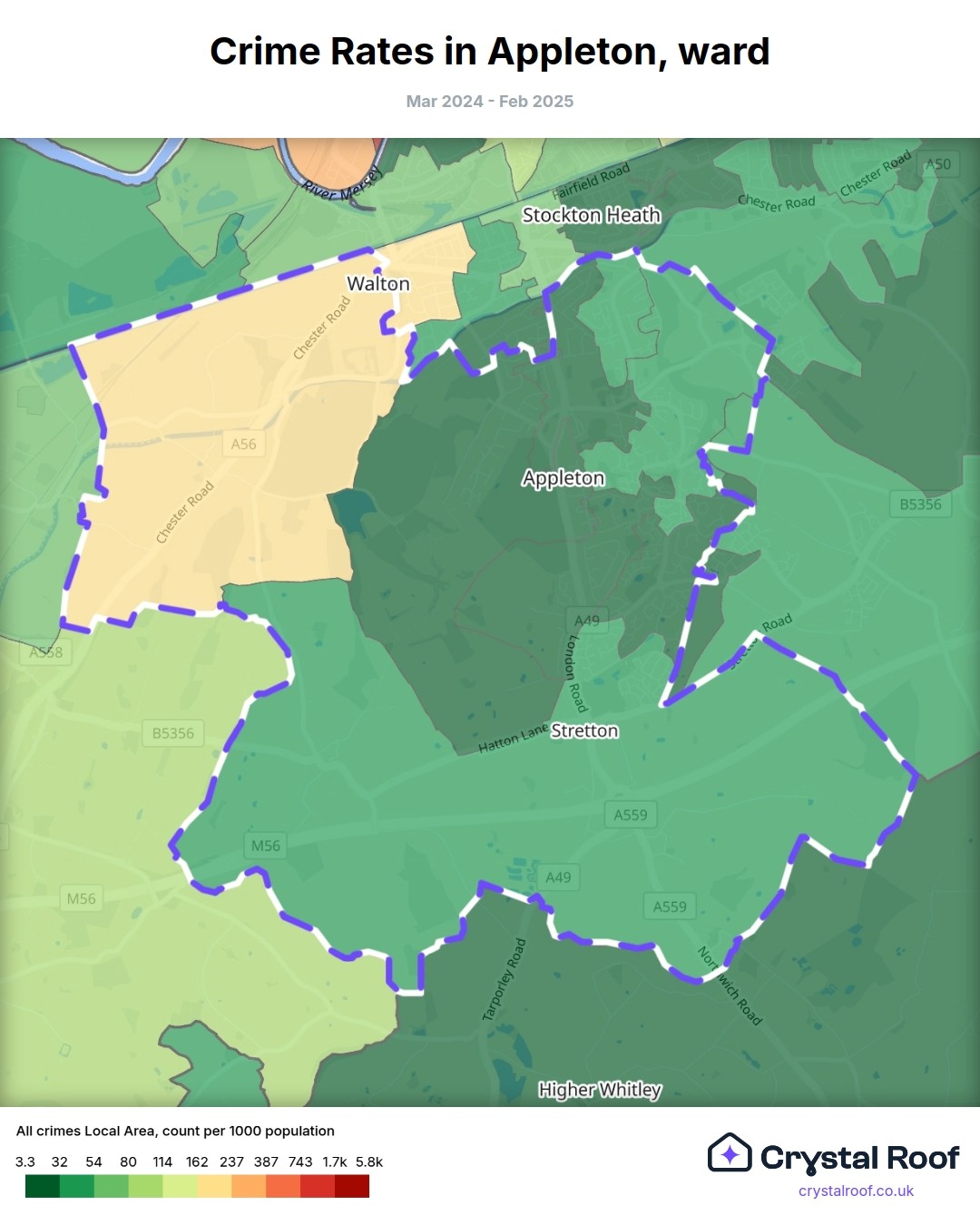 Appleton (ward) is located within Warrington (borough). Annual total crime rate in Warrington (borough) is 71.2 crimes per thousand resident population, which can be rated as 2 out of 10 or low crime level compared to other local authority districts in England and Wales.