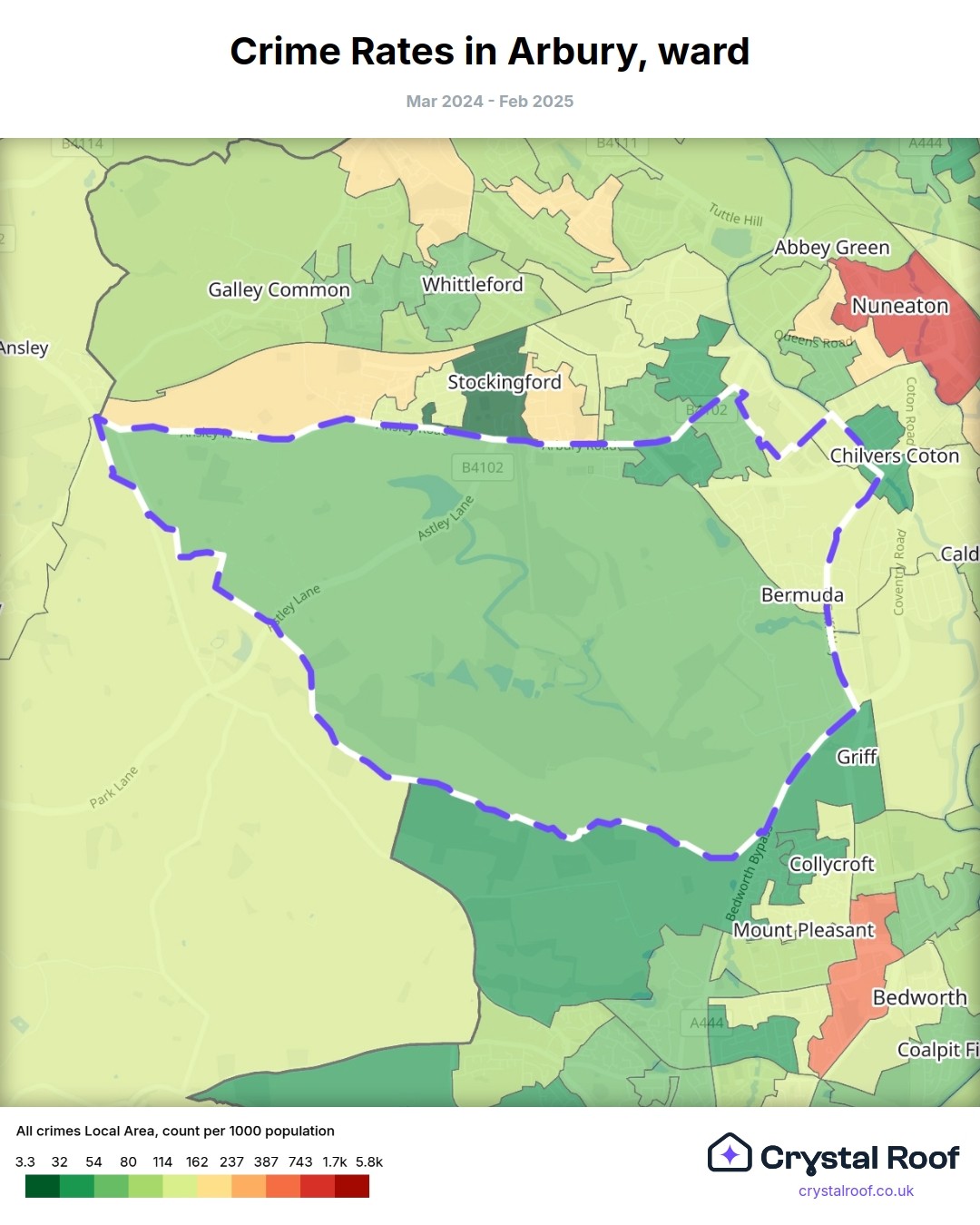 Arbury (ward) is located within Nuneaton and Bedworth (borough). Annual total crime rate in Nuneaton and Bedworth (borough) is 110 crimes per thousand resident population, which can be rated as 5 out of 10 or medium crime level compared to other local authority districts in England and Wales.