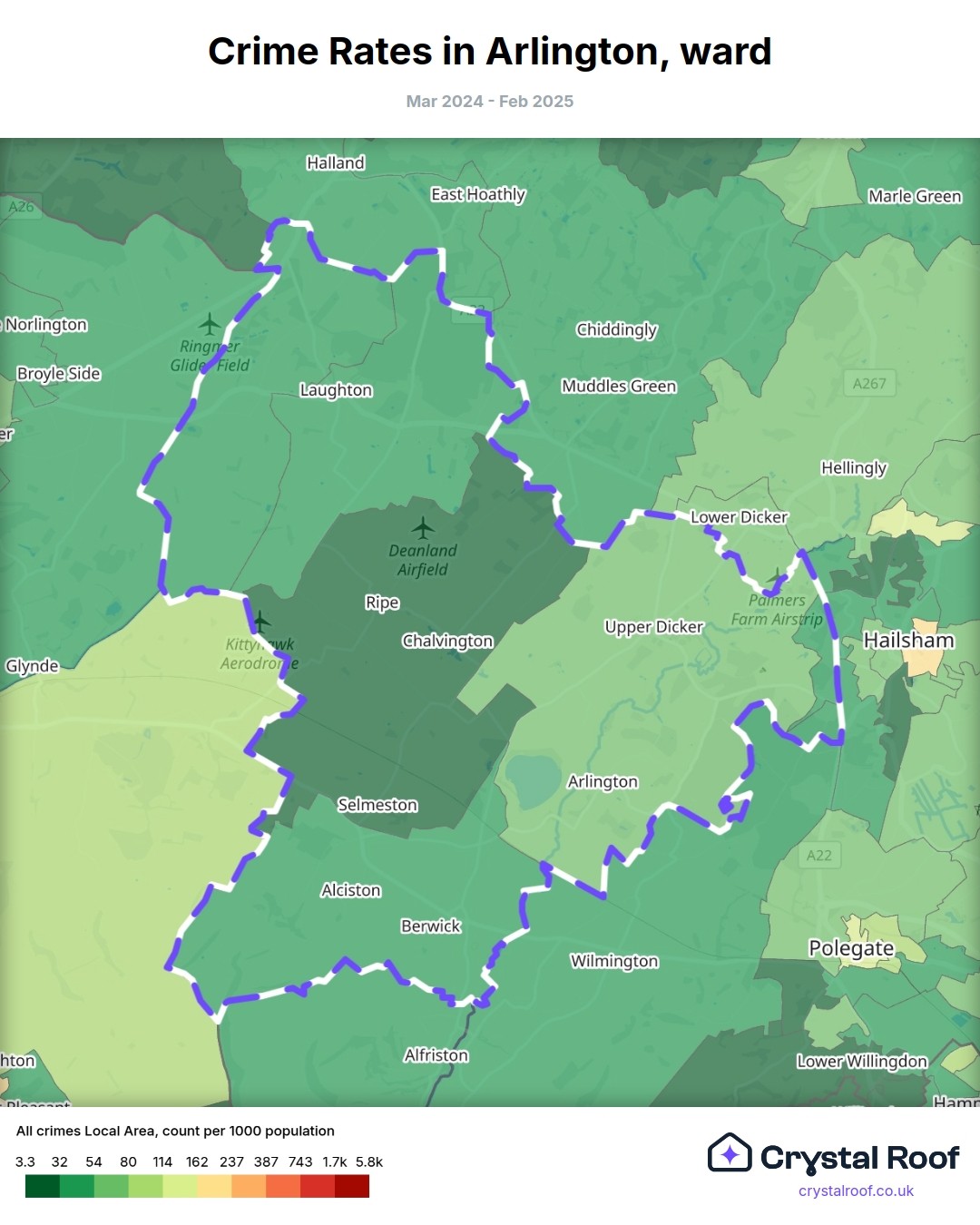 Arlington (ward) is located within Wealden (borough). Annual total crime rate in Wealden (borough) is 49.2 crimes per thousand resident population, which can be rated as 1 out of 10 or low crime level compared to other local authority districts in England and Wales.