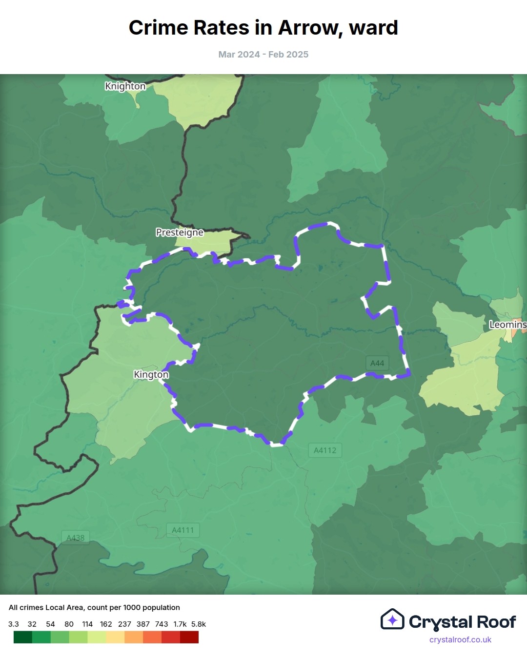The figures in grey indicate the relative ratings of Arrow (ward) for a specific crime type compared to other wards in England and Wales.
