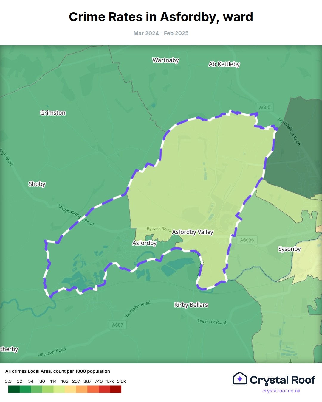 Asfordby, (ward) includes areas with the following crime ratings (see map):