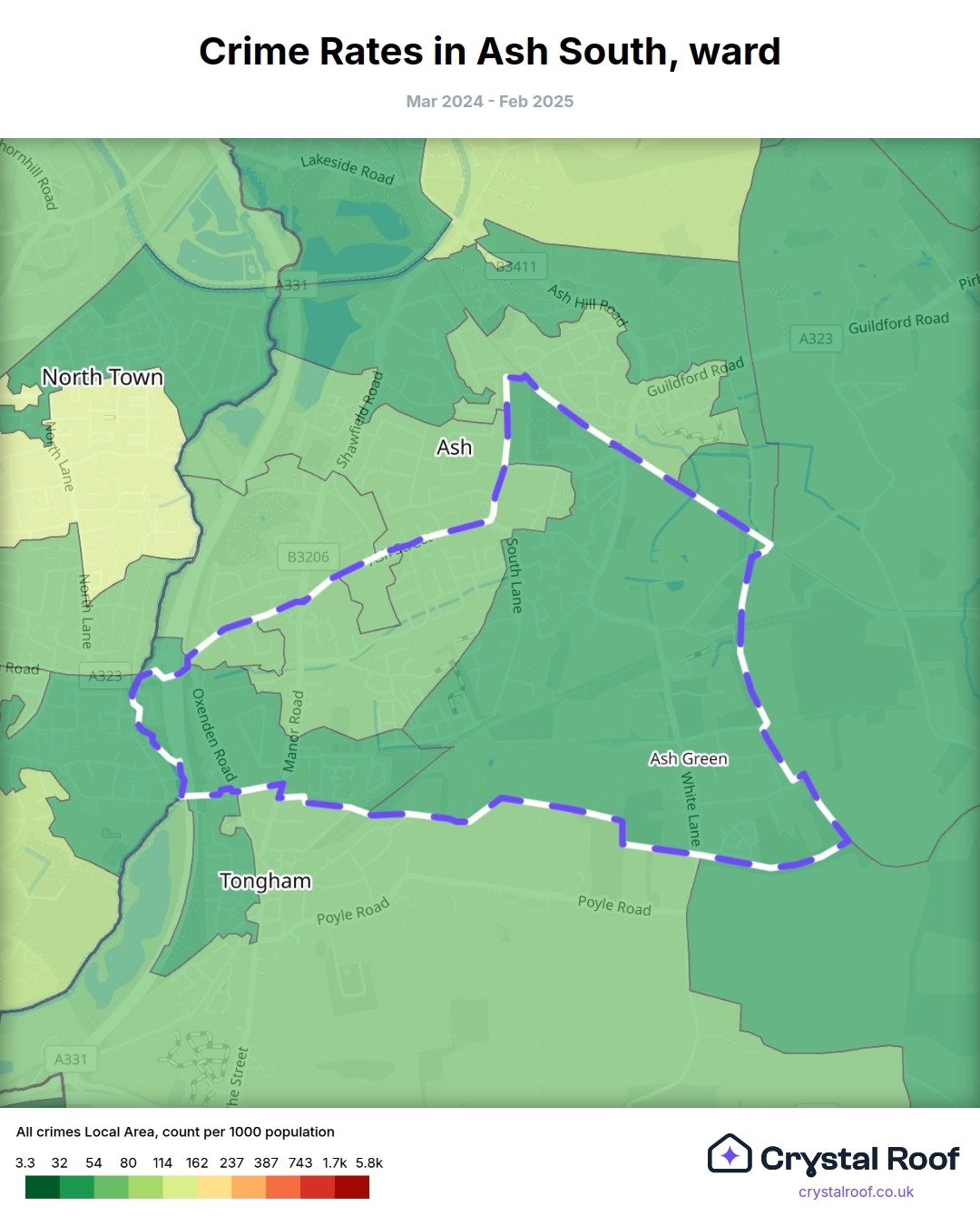 Ash South, (ward) includes areas with the following crime ratings (see map):