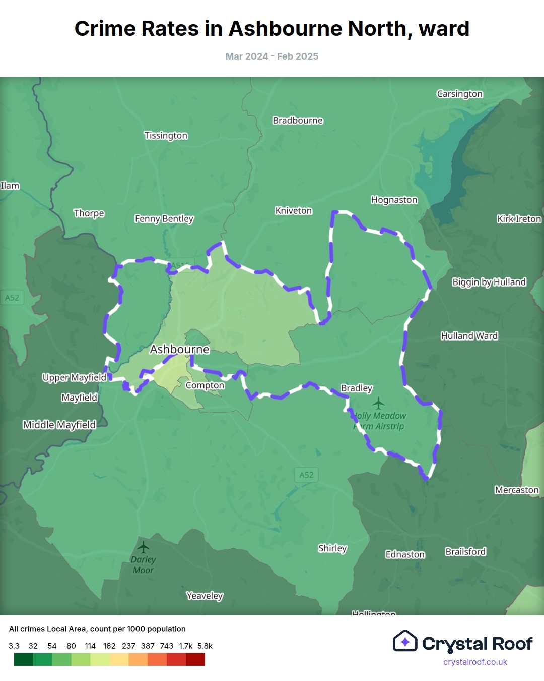 Ashbourne North, (ward) includes areas with the following crime ratings (see map):