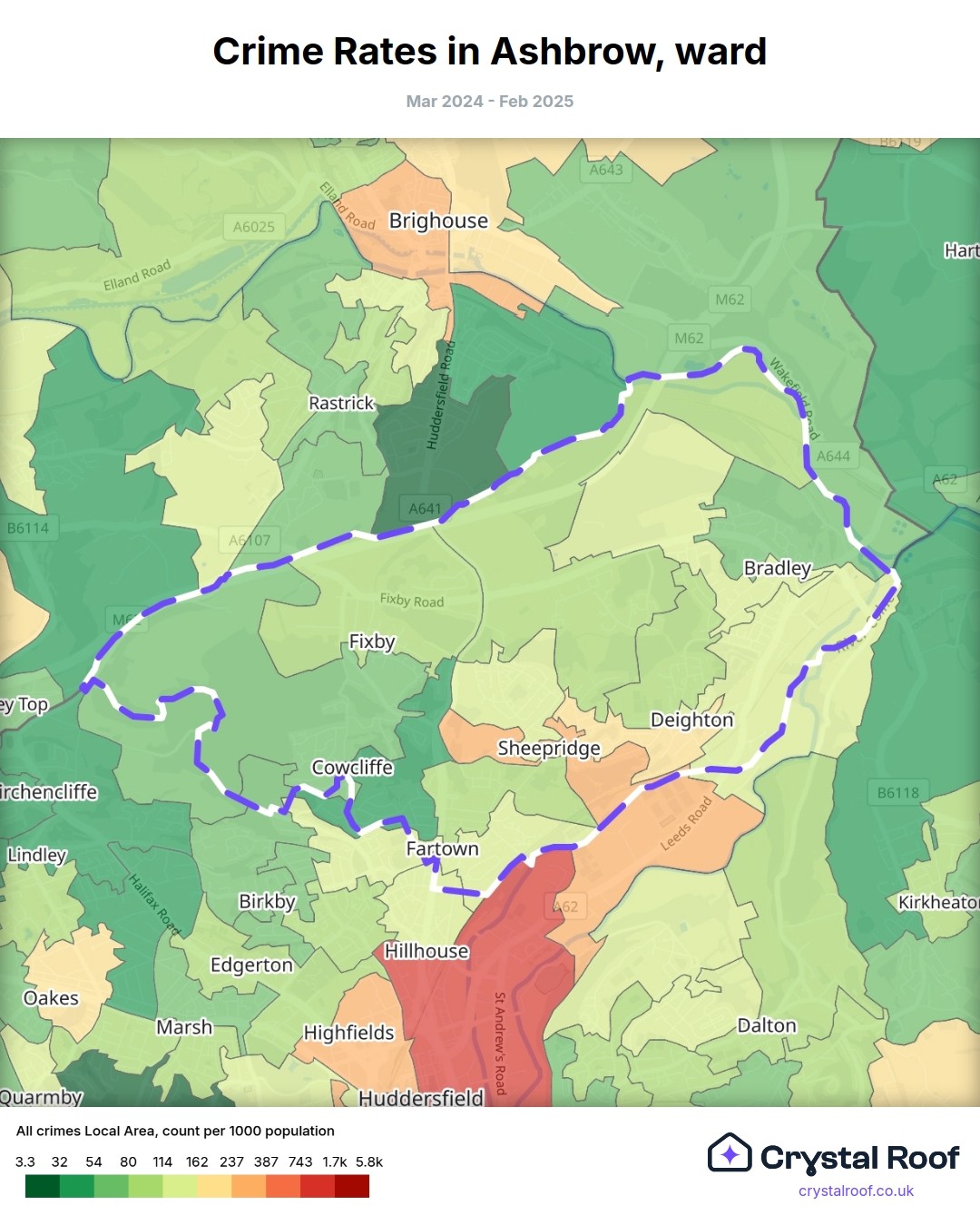 Ashbrow (ward) is located within Kirklees (borough). Annual total crime rate in Kirklees (borough) is 103 crimes per thousand resident population, which can be rated as 5 out of 10 or medium crime level compared to other local authority districts in England and Wales.