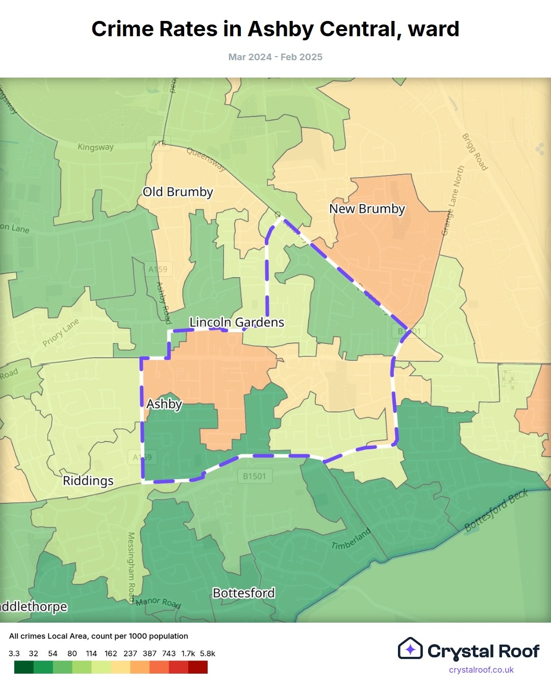 Ashby Central, (ward) includes areas with the following crime ratings (see map):