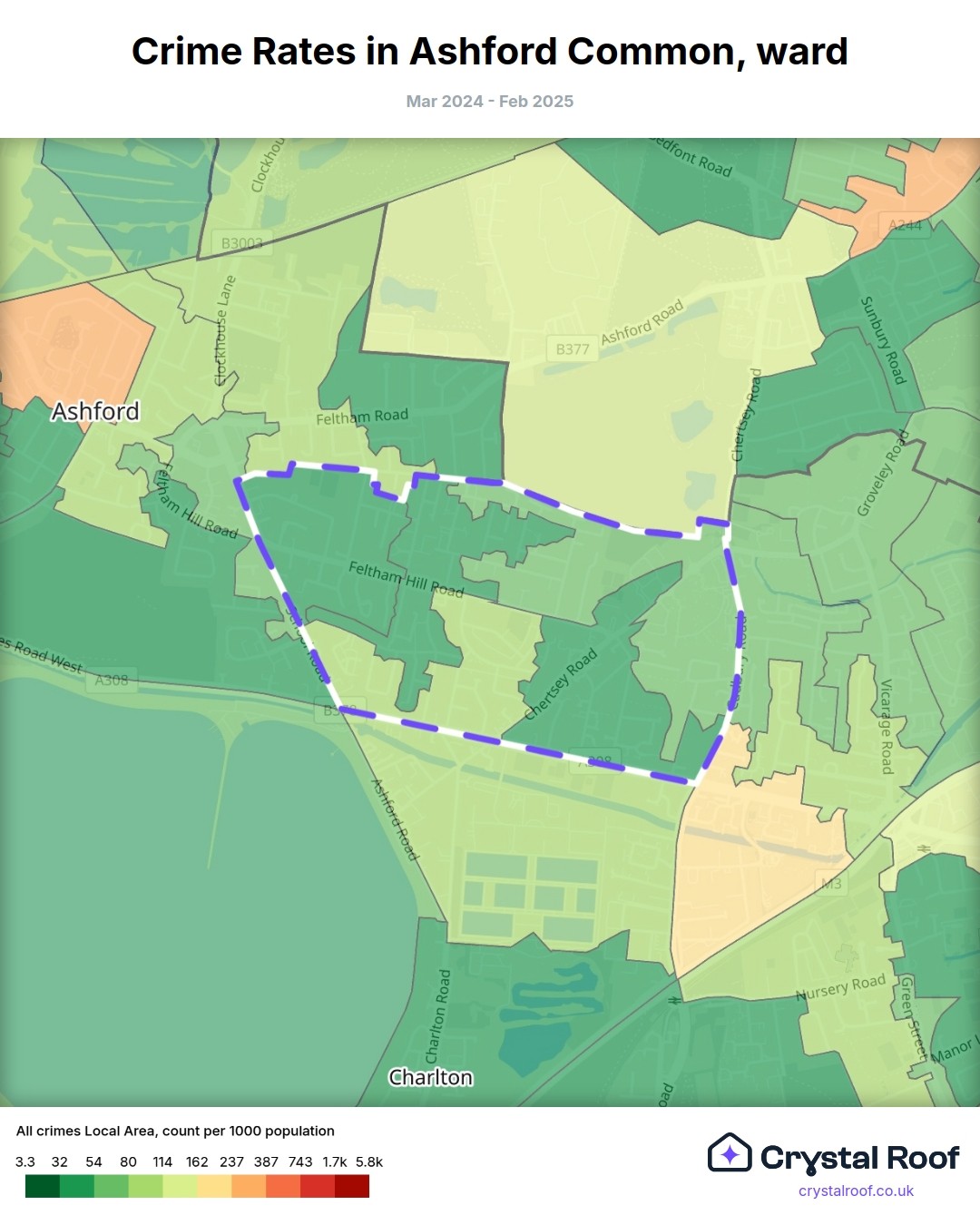 Ashford Common, (ward) includes areas with the following crime ratings (see map):