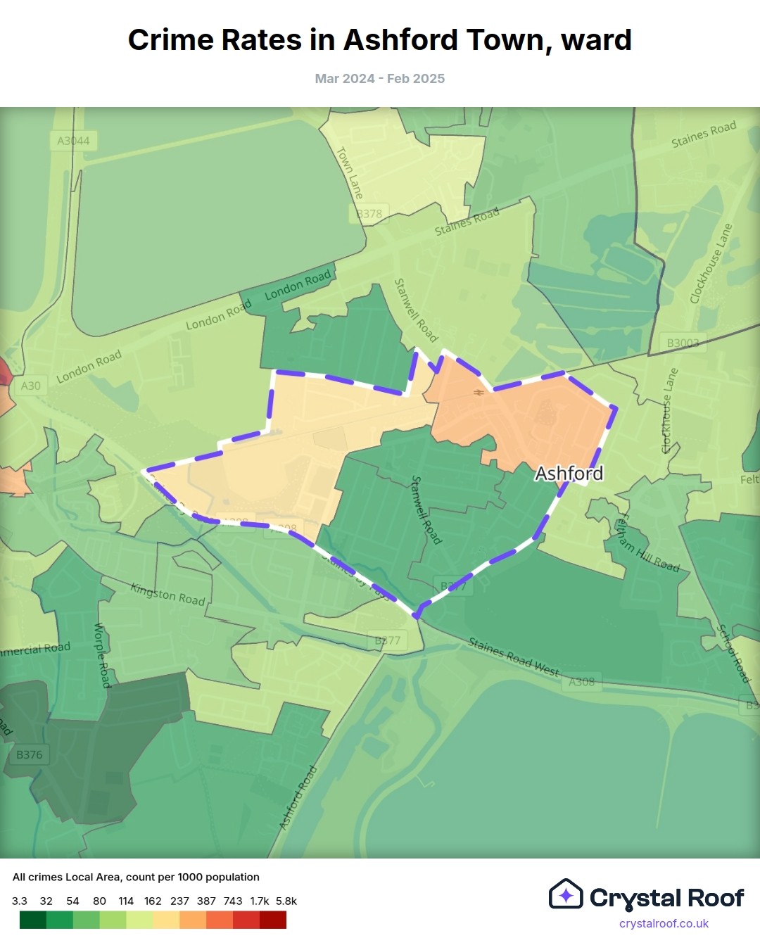 Ashford Town, (ward) includes areas with the following crime ratings (see map):