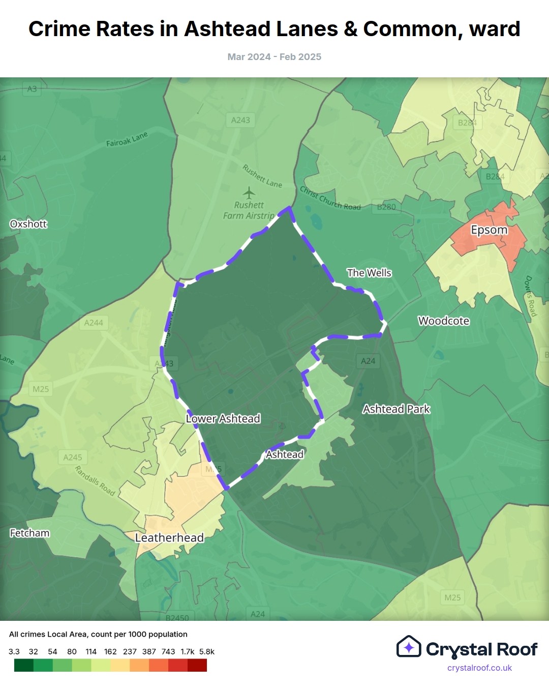 Ashtead Lanes & Common, (ward) includes areas with the following crime ratings (see map):