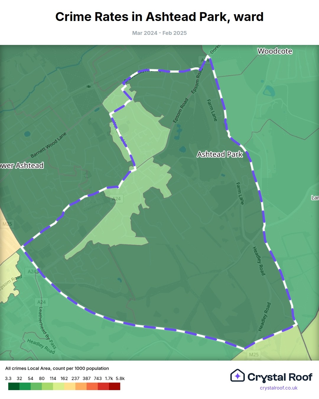Ashtead Park, (ward) includes areas with the following crime ratings (see map):