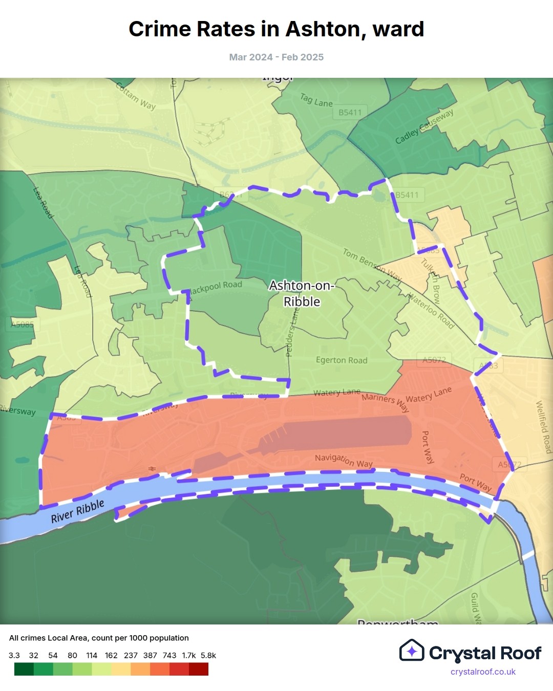 Ashton (ward) is located within Preston (borough). Annual total crime rate in Preston (borough) is 153 crimes per thousand resident population, which can be rated as 7 out of 10 or high crime level compared to other local authority districts in England and Wales.