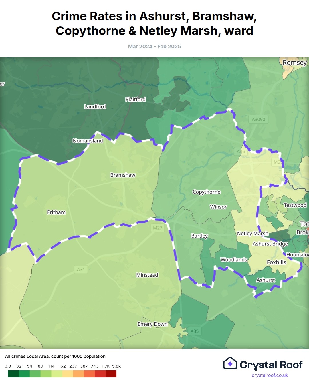 Ashurst, Bramshaw, Copythorne & Netley Marsh, (ward) includes areas with the following crime ratings (see map):