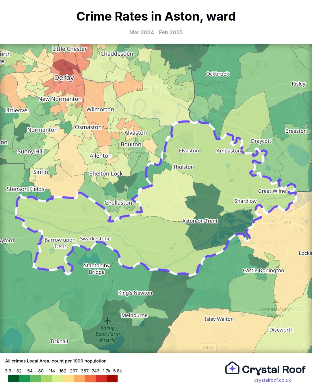 Aston (ward) is located within South Derbyshire (borough). Annual total crime rate in South Derbyshire (borough) is 70.9 crimes per thousand resident population, which can be rated as 2 out of 10 or low crime level compared to other local authority districts in England and Wales.