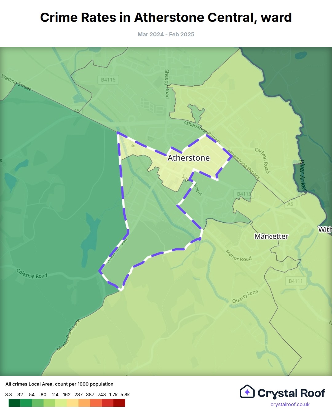 The figures in grey indicate the relative ratings of Atherstone Central (ward) for a specific crime type compared to other wards in England and Wales.