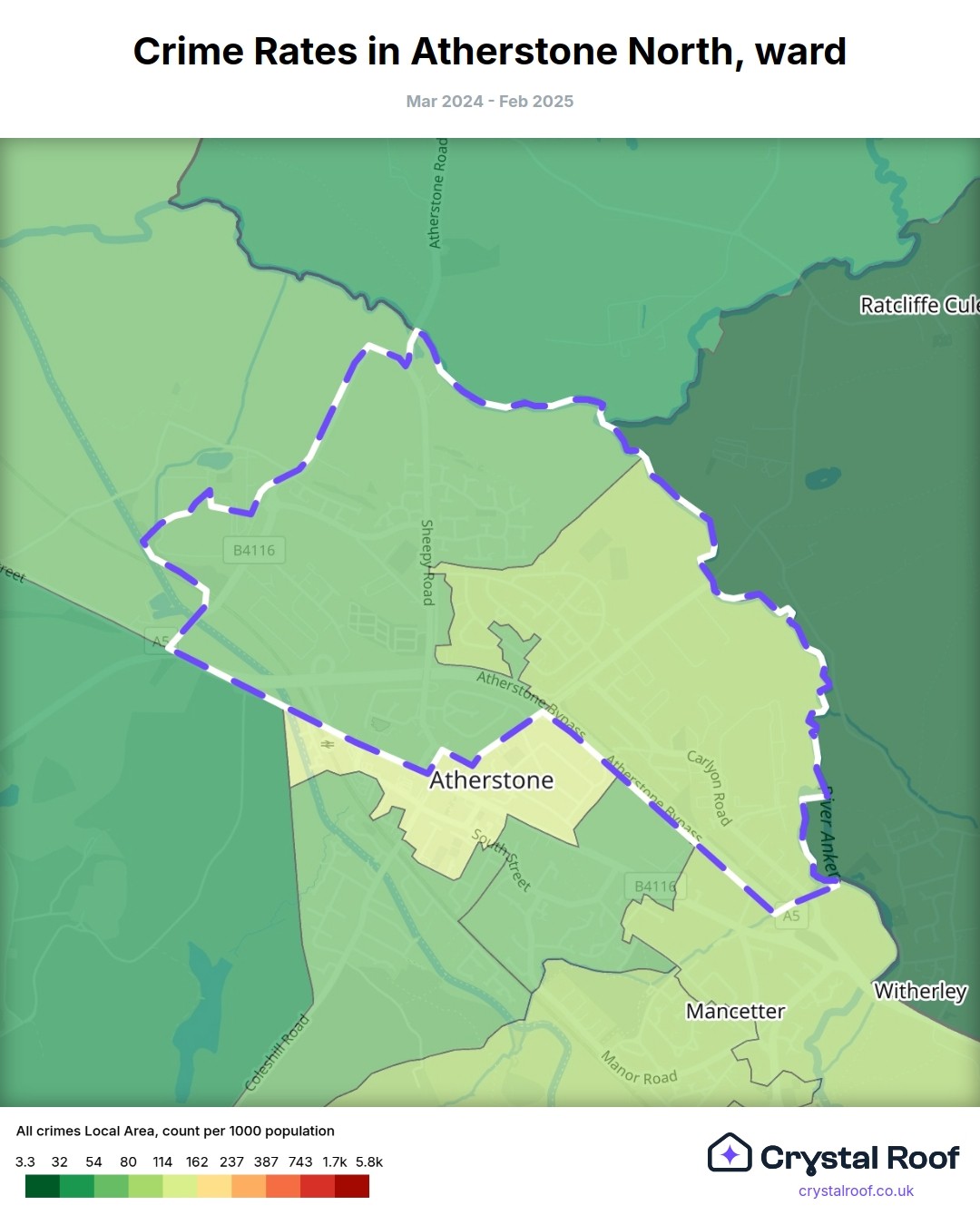 The figures in grey indicate the relative ratings of Atherstone North (ward) for a specific crime type compared to other wards in England and Wales.
