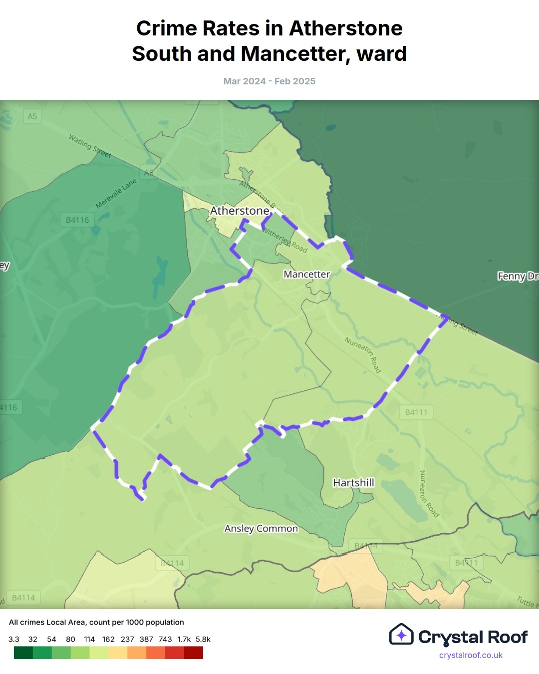 Atherstone South and Mancetter, (ward) includes areas with the following crime ratings (see map):