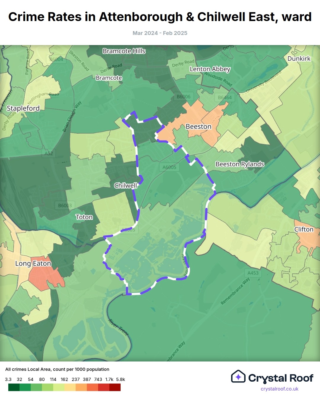 Attenborough & Chilwell East, (ward) includes areas with the following crime ratings (see map):