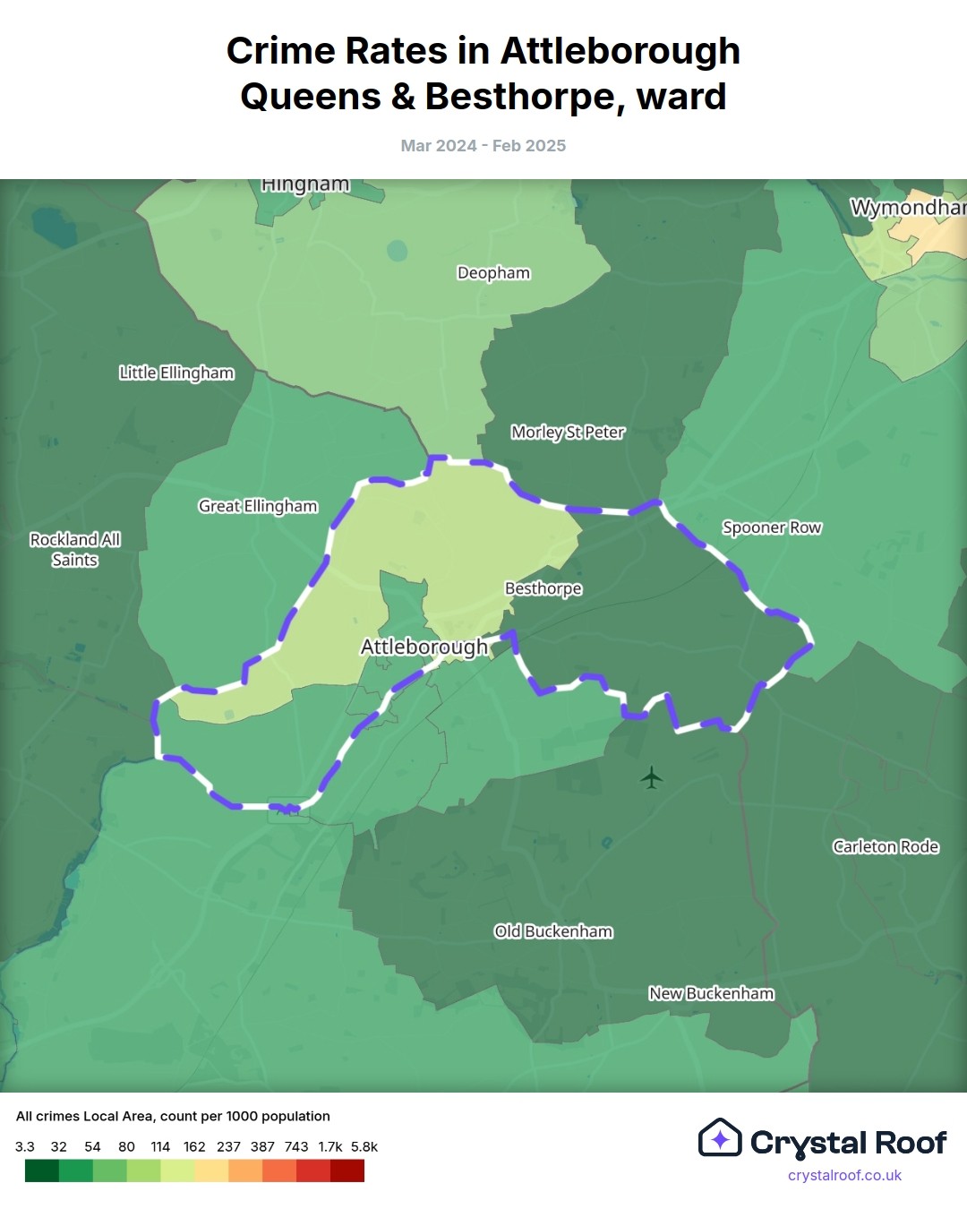 The figures in grey indicate the relative ratings of Attleborough Queens & Besthorpe (ward) for a specific crime type compared to other wards in England and Wales.