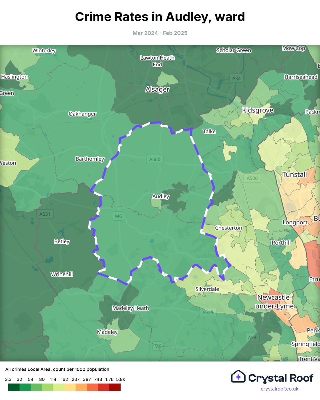 Audley, (ward) includes areas with the following crime ratings (see map):
