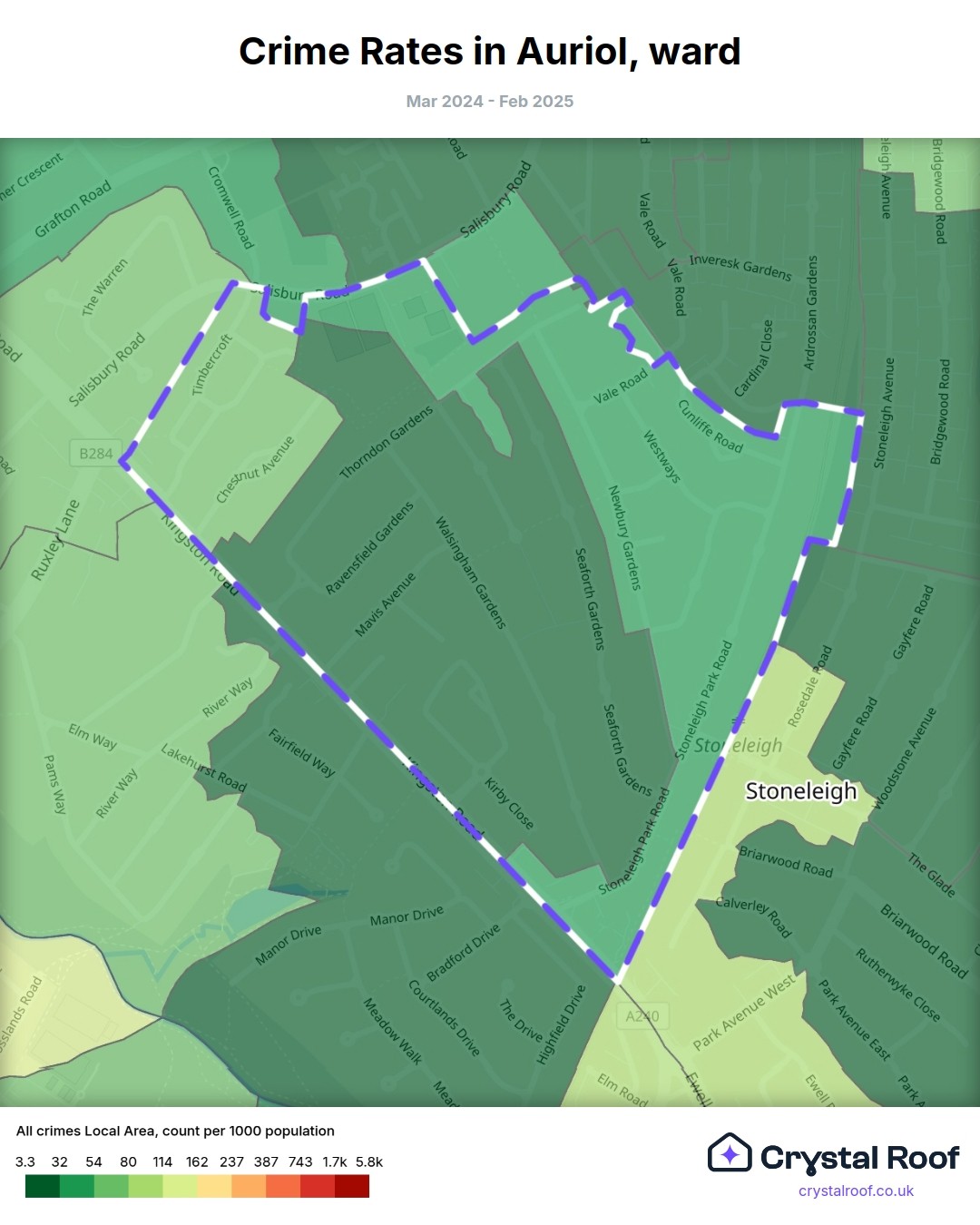 Auriol, (ward) includes areas with the following crime ratings (see map):