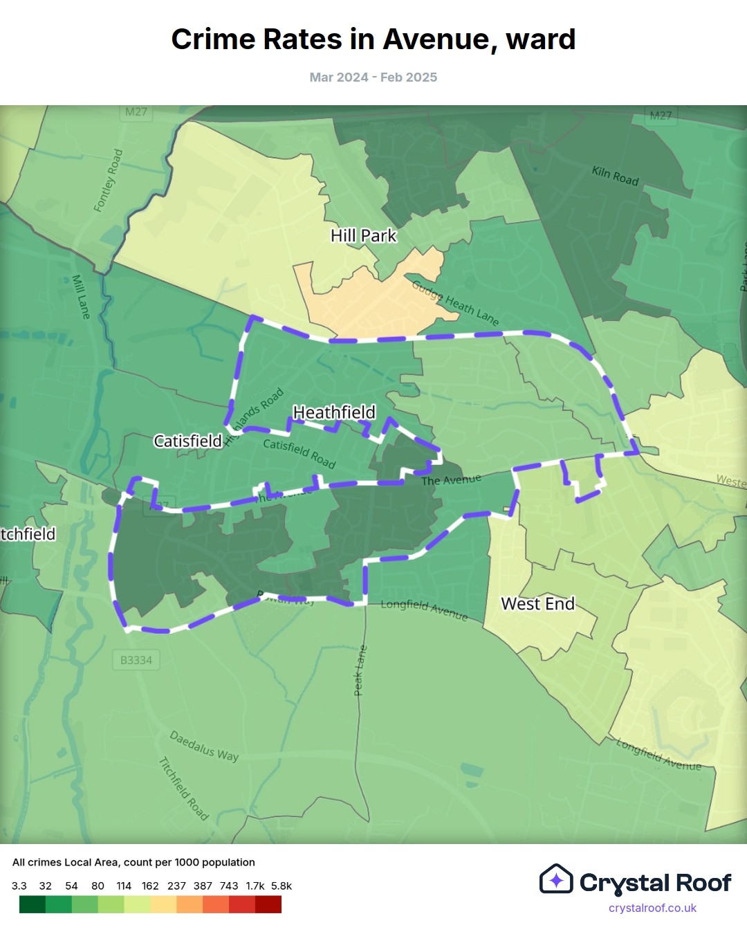 Avenue (ward) is located within Fareham (borough). Annual total crime rate in Fareham (borough) is 59.3 crimes per thousand resident population, which can be rated as 2 out of 10 or low crime level compared to other local authority districts in England and Wales.