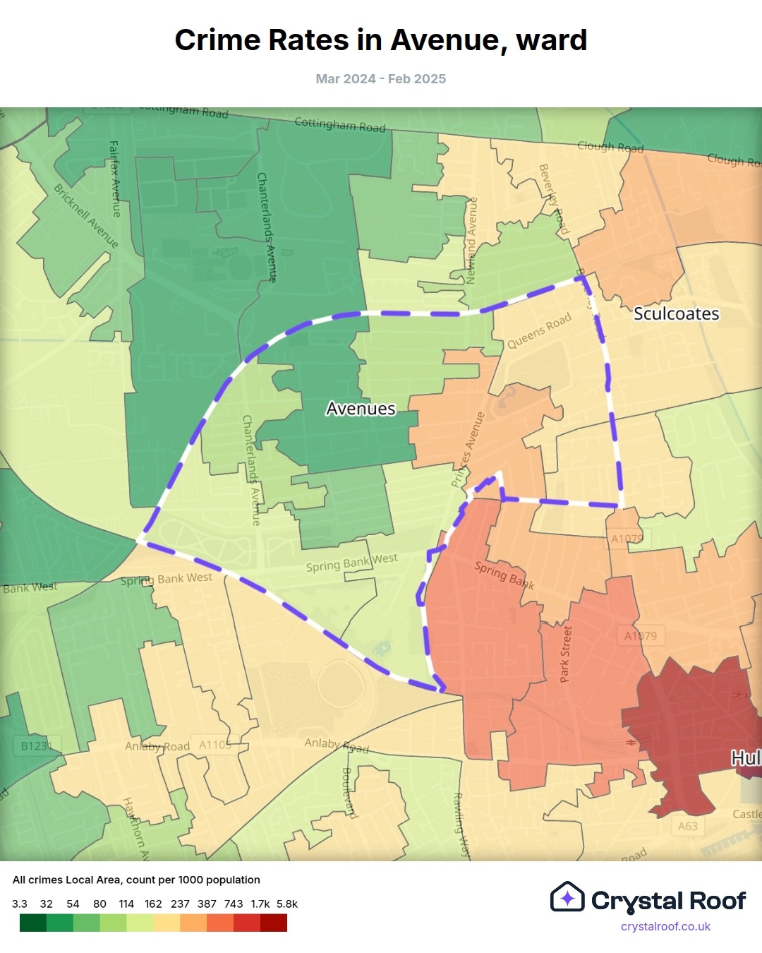 The figures in grey indicate the relative ratings of Avenue (ward) for a specific crime type compared to other wards in England and Wales.
