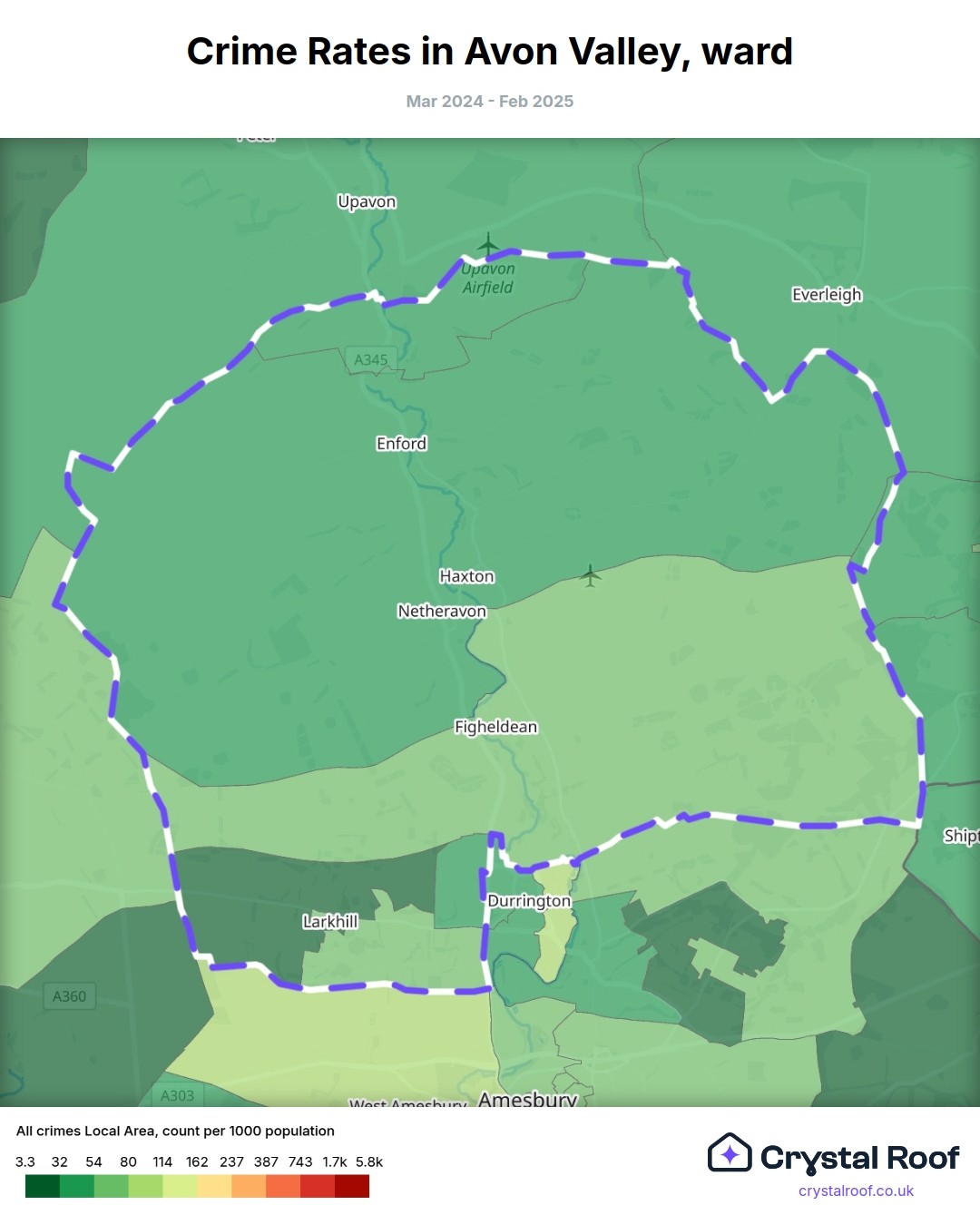 Avon Valley (ward) is located within Wiltshire (borough). Annual total crime rate in Wiltshire (borough) is 62.1 crimes per thousand resident population, which can be rated as 2 out of 10 or low crime level compared to other local authority districts in England and Wales.