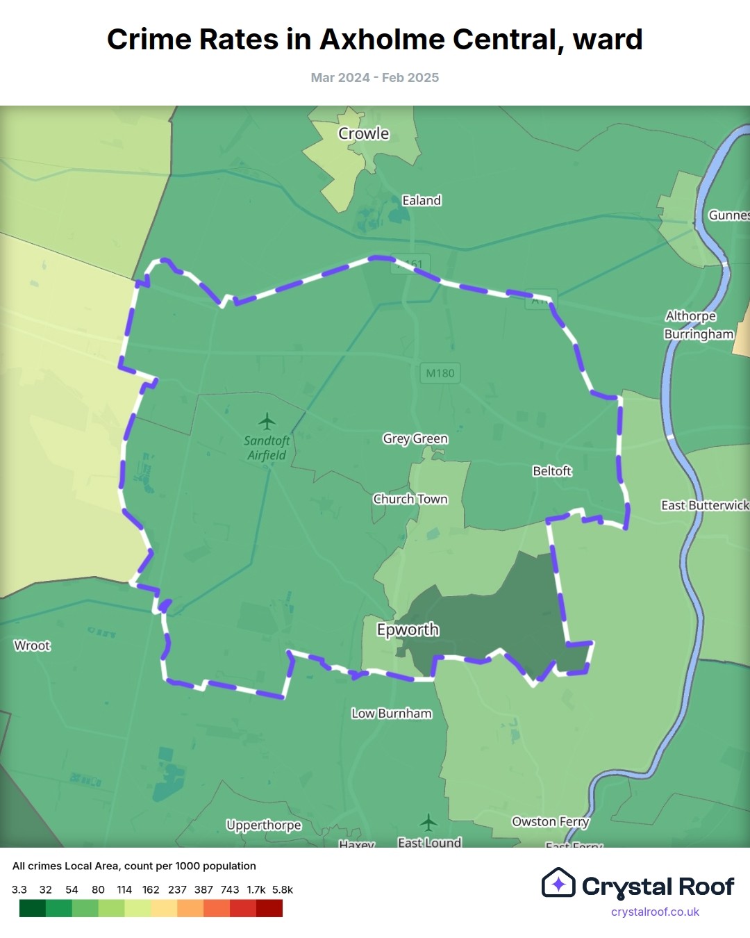 The figures in grey indicate the relative ratings of Axholme Central (ward) for a specific crime type compared to other wards in England and Wales.