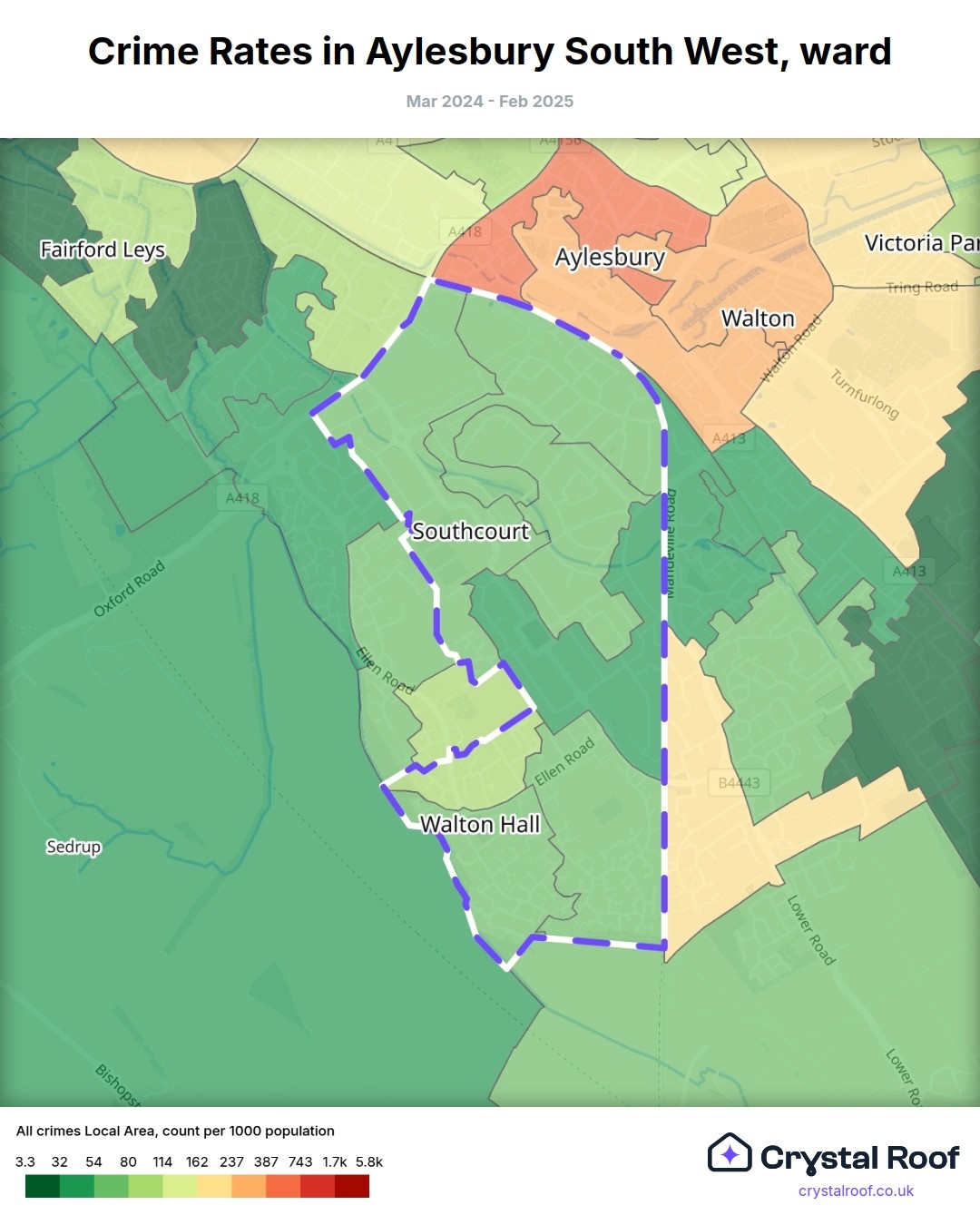 Aylesbury South West, (ward) includes areas with the following crime ratings (see map):