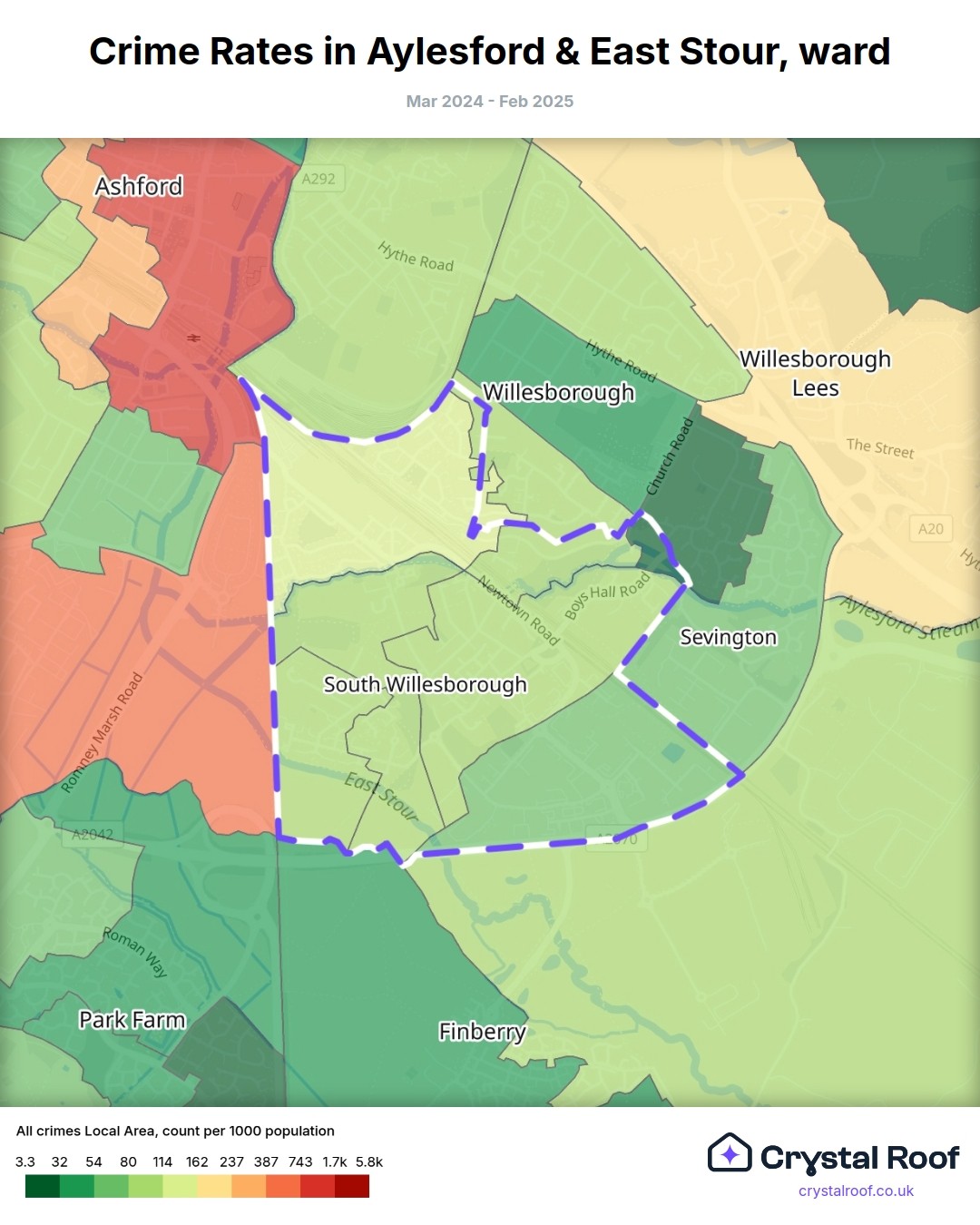 Aylesford & East Stour, (ward) includes areas with the following crime ratings (see map):