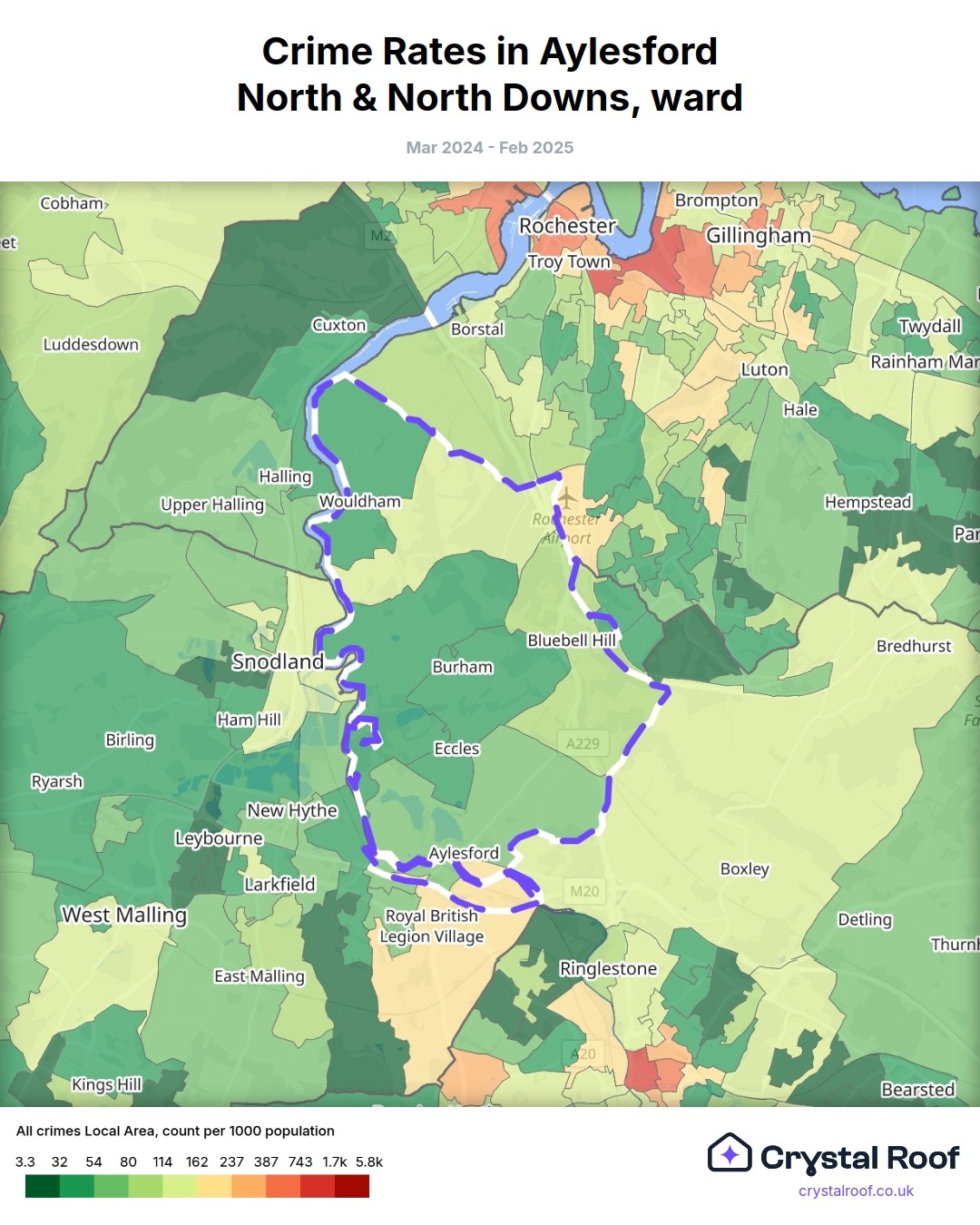 Aylesford North & North Downs, (ward) includes areas with the following crime ratings (see map):