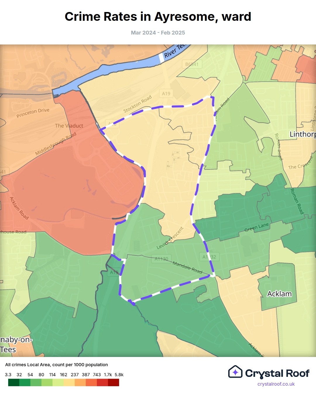 Ayresome, (ward) includes areas with the following crime ratings (see map):