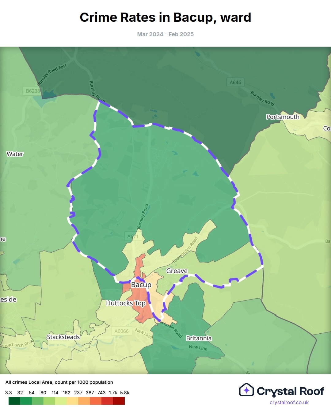 The figures in grey indicate the relative ratings of Bacup (ward) for a specific crime type compared to other wards in England and Wales.