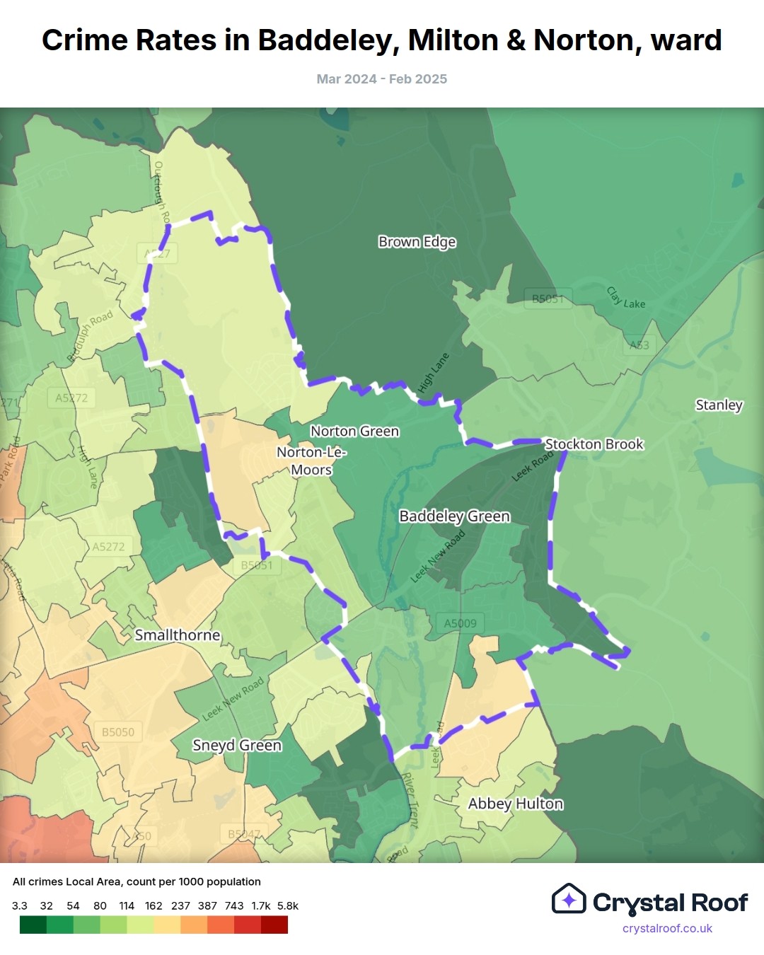 Baddeley, Milton & Norton, (ward) includes areas with the following crime ratings (see map):
