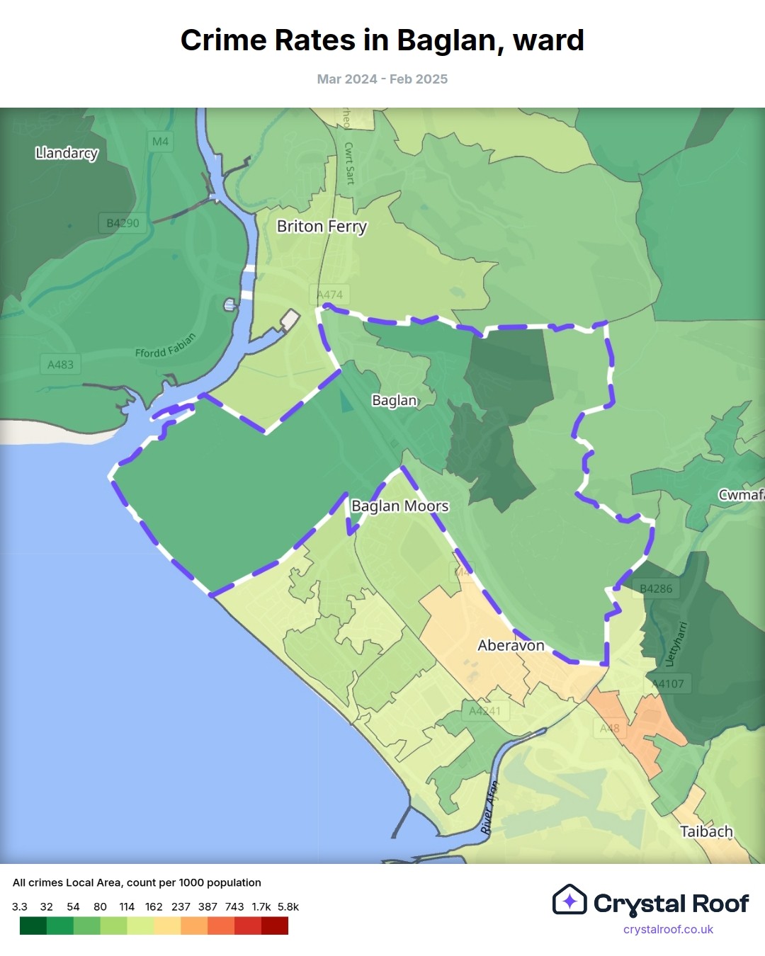 The figures in grey indicate the relative ratings of Baglan (ward) for a specific crime type compared to other wards in England and Wales.