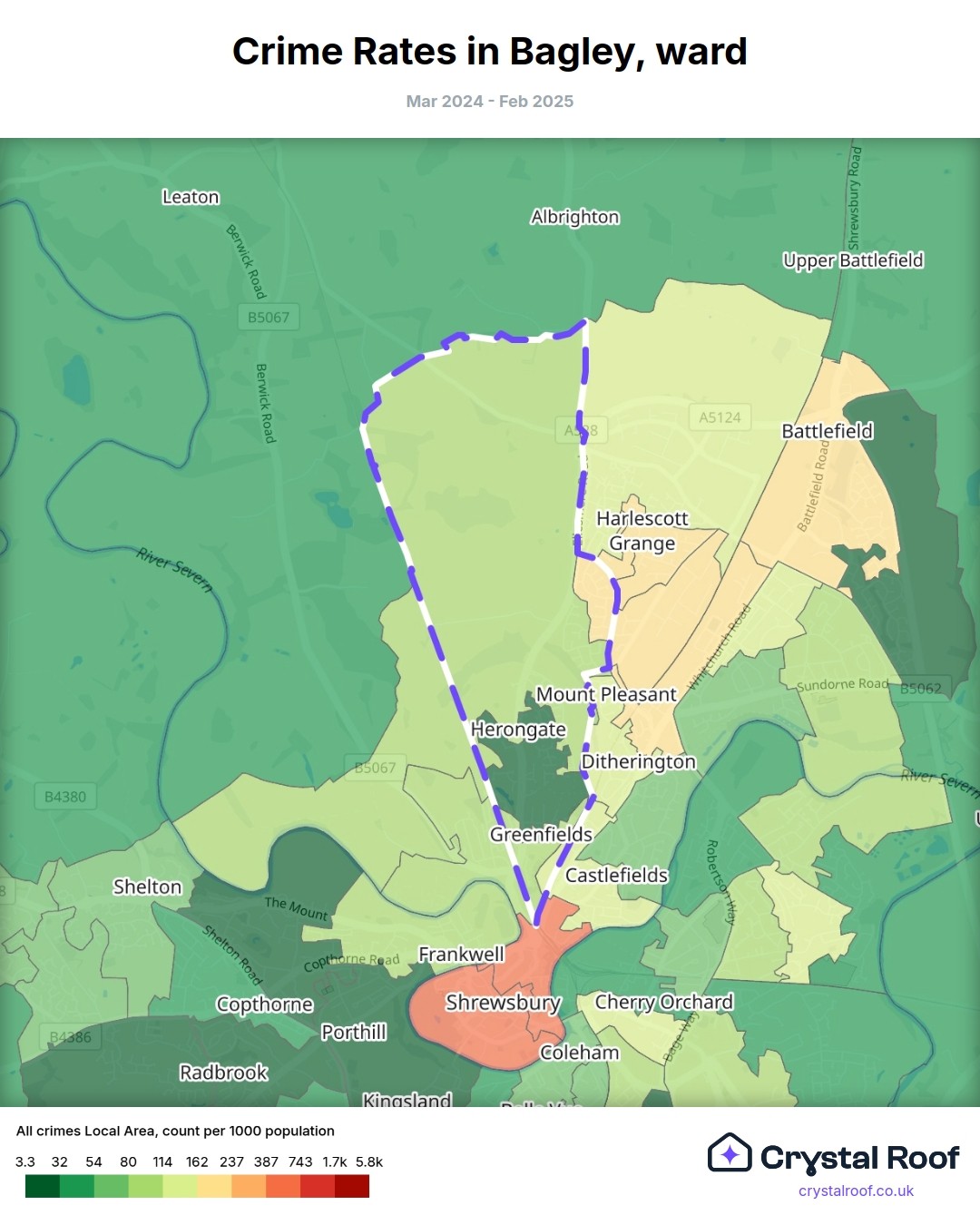 Bagley (ward) is located within Shropshire (borough). Annual total crime rate in Shropshire (borough) is 62.3 crimes per thousand resident population, which can be rated as 2 out of 10 or low crime level compared to other local authority districts in England and Wales.