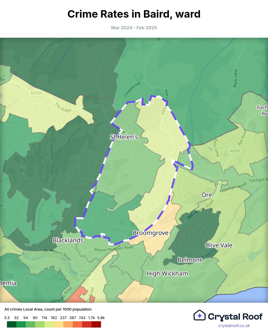 Baird (ward) is located within Hastings (borough). Annual total crime rate in Hastings (borough) is 115 crimes per thousand resident population, which can be rated as 6 out of 10 or medium crime level compared to other local authority districts in England and Wales.