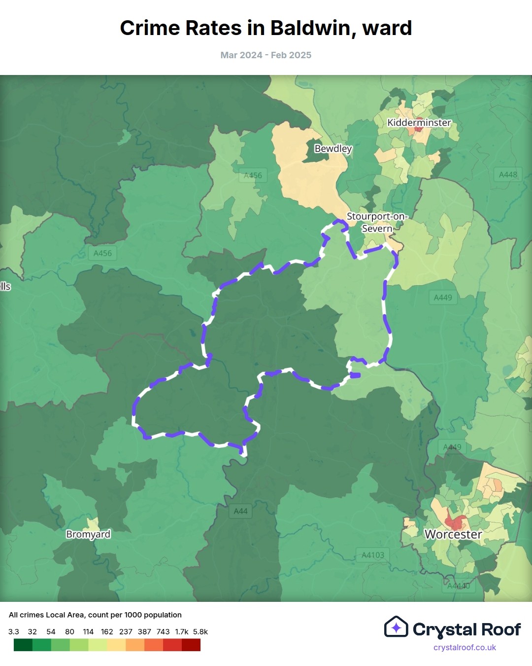 Baldwin (ward) is located within Malvern Hills (borough). Annual total crime rate in Malvern Hills (borough) is 58.3 crimes per thousand resident population, which can be rated as 2 out of 10 or low crime level compared to other local authority districts in England and Wales.