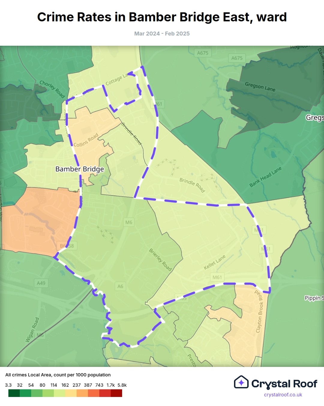 Bamber Bridge East, (ward) includes areas with the following crime ratings (see map):